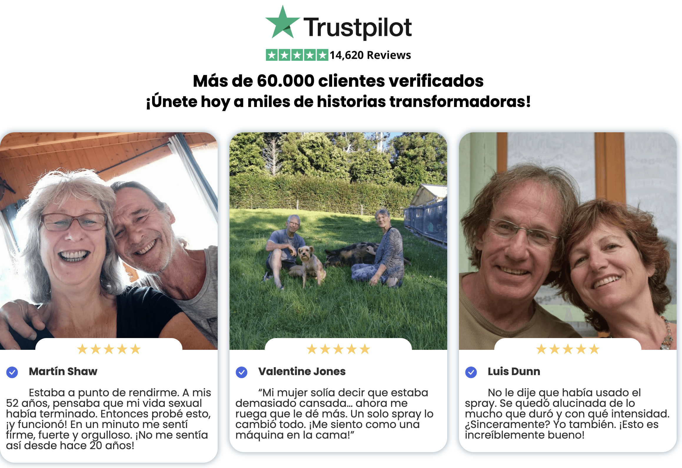 Su formato en spray permite una absorción rápida y práctica, sin pastillas, sin complicaciones y sin necesidad de cambiar tu rutina. Los clientes que lo usan reportan sentirse más confiados, con mayor rendimiento y una intimidad más intensa. Los resultados pueden variar en cada persona.